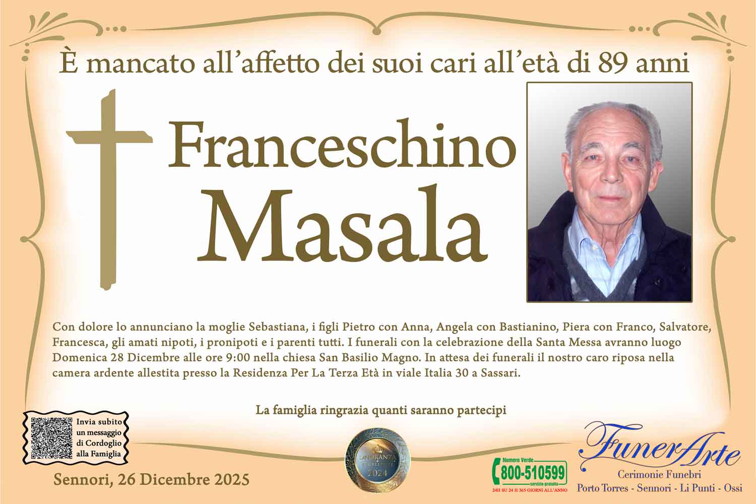 Ne danno il triste annuncio le addolorate figlie Romina e Danila. I funerali con la celebrazione della Santa Messa avranno luogo domani Martedì 30 dicembre alle ore 15:00 nella Basilica di San Gavino. Nell’attesa dei funerali il nostro caro riposa nella camera ardente allestita presso la propria abitazione in Via Sassari 61.