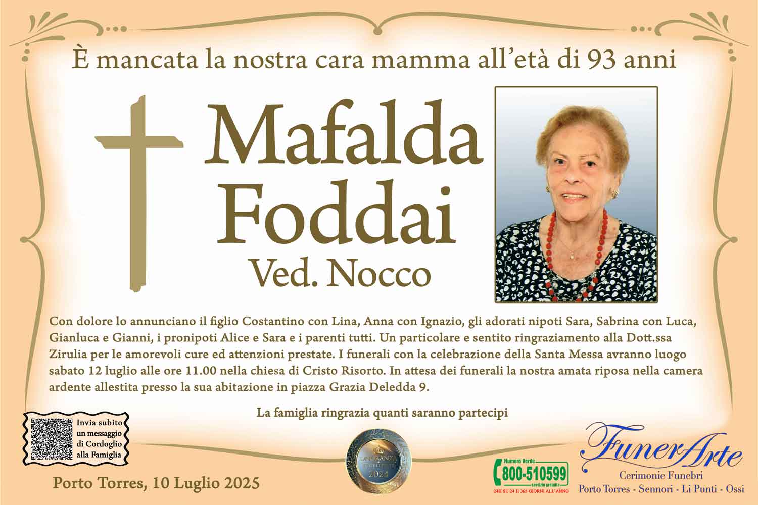 Con dolore lo annunciano il figlio Costantino con Lina, Anna con Ignazio, gli adorati nipoti Sara, Sabrina con Luca, Gianluca e Gianni, i pronipoti Alice e Sara e i parenti tutti. Un particolare e sentito ringraziamento alla Dott.ssa Zirulia per le amorevoli cure ed attenzioni prestate. I funerali con la celebrazione della Santa Messa avranno luogo sabato 12 luglio alle ore 11.00 nella chiesa di Cristo Risorto. In attesa dei funerali la nostra amata riposa nella camera ardente allestita presso la sua abitazione in piazza Grazia Deledda 9.