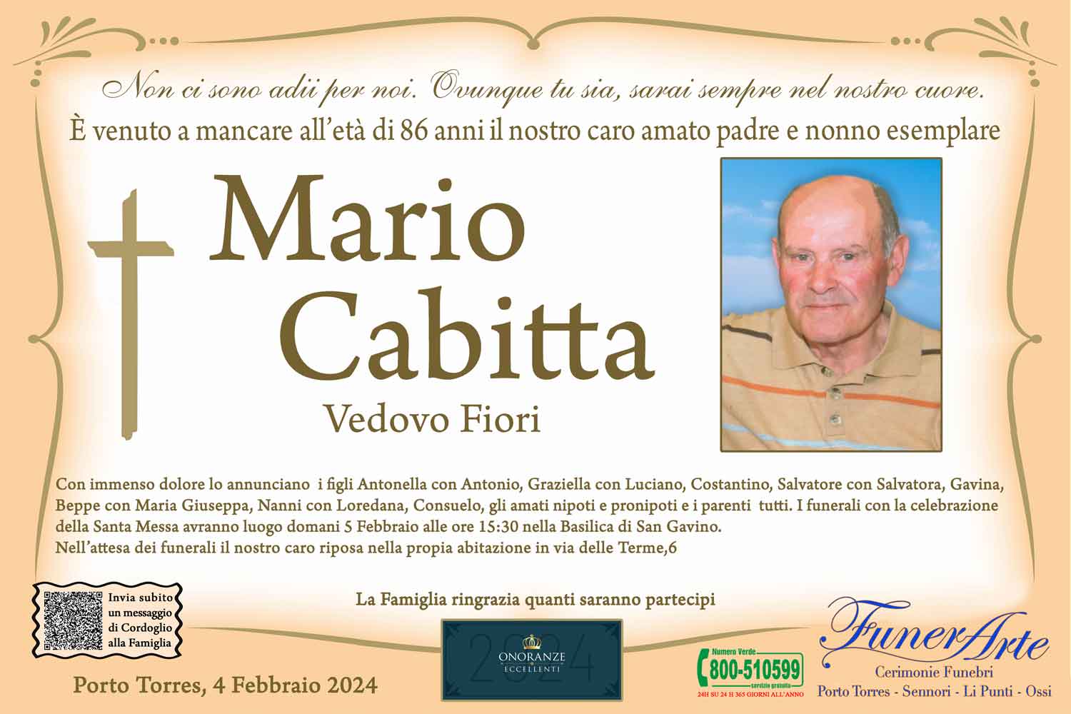 CON IMMENSO DOLORE LO ANNUNCIANO I FIGLI ANTONELLA CON ANTONIO, GRAZIELLA CON LUCIANO, COSTANTINO, SALVATORE CON SALVATORA, GAVINA, BEPPE CON MARIA GIUSEPPA, NANNI CON LOREDANA, CONSUELO, GLI AMATI NIPOTI E PRONIPOTI E I PARENTI TUTTI. I FUNERALI CON LA CELEBRAZIONE DELLA SANTA MESSA AVRANNO LUOGO DOMANI 5 FEBBRAIO ALLE ORE 15:30 NELLA BASILICA DI SAN GAVINO. NELL' ATTESA DEI FUNERALI IL NOSTRO CARO RIPOSA NELLA PROPRIA ABITAZIONE IN VIA DELLE TERME N°6