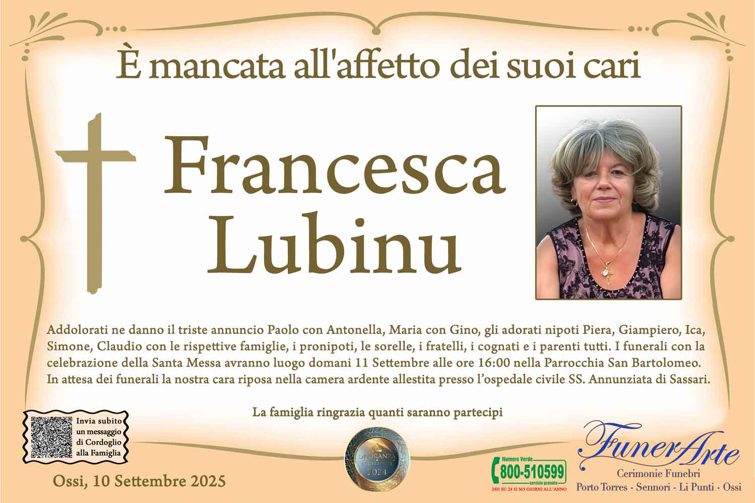 Addolorati ne danno il triste annuncio Paolo con Antonella, Maria con Gino, gli adorati nipoti Piera, Giampiero, Ica, Simone, Claudio con le rispettive famiglie, i pronipoti, le sorelle, i fratelli, i cognati e i parenti tutti. I funerali con la celebrazione della Santa Messa avranno luogo domani 11 Settembre alle ore 16:00 nella Parrocchia San Bartolomeo. In attesa dei funerali la nostra cara riposa nella camera ardente allestita presso l’ospedale civile SS. Annunziata di Sassari.