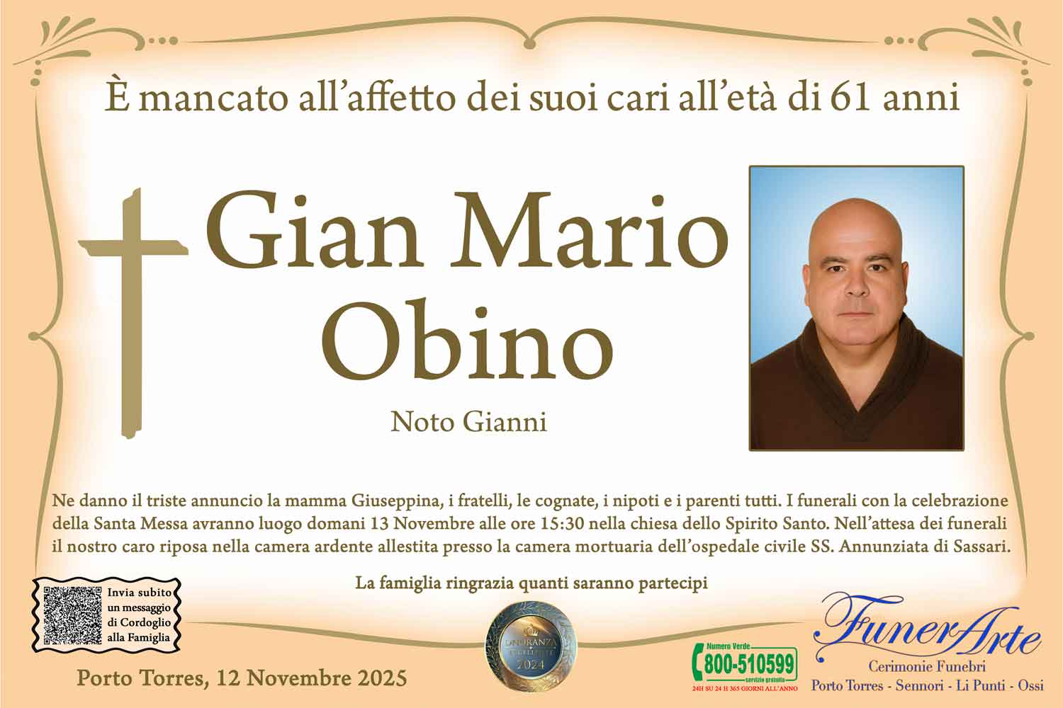 Ne danno il triste annuncio la mamma Giuseppina, i fratelli, le cognate, i nipoti e i parenti tutti. I funerali con la celebrazione della Santa Messa avranno luogo domani 13 Novembre alle ore 15:30 nella chiesa dello Spirito Santo. Nell’attesa dei funerali il nostro caro riposa nella camera ardente allestita presso la camera mortuaria dell’ospedale civile SS. Annunziata di Sassari.
