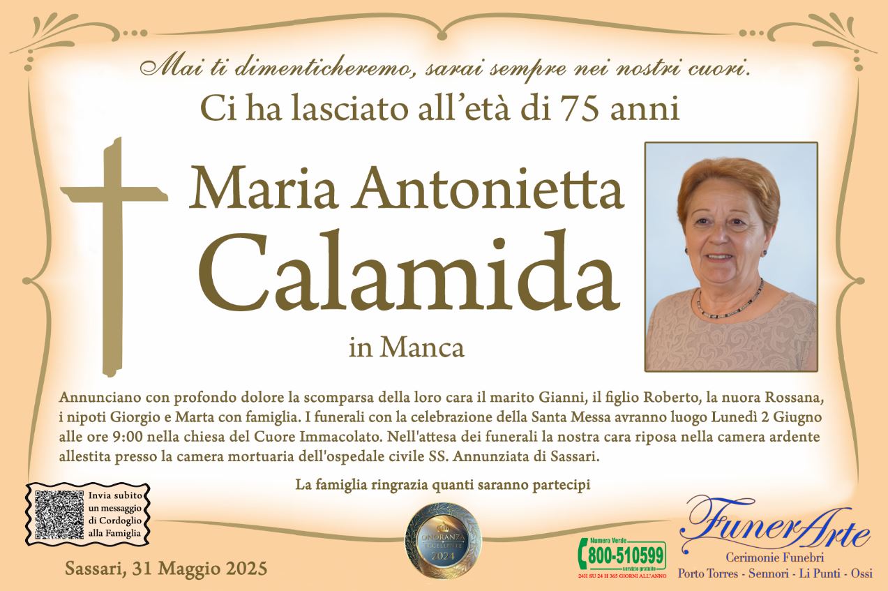 Annunciano con profondo dolore la scomparsa della loro cara il marito Gianni, il figlio Roberto, la nuora Rossana, i nipoti Giorgio e Marta con famiglia. I funerali con la celebrazione della Santa Messa avranno luogo Lunedì 2 Giugno alle ore 9:00 nella chiesa del Cuore Immacolato. Nell'attesa dei funerali la nostra cara riposa nella camera ardente allestita presso la camera mortuaria dell'ospedale civile SS. Annunziata di Sassari.