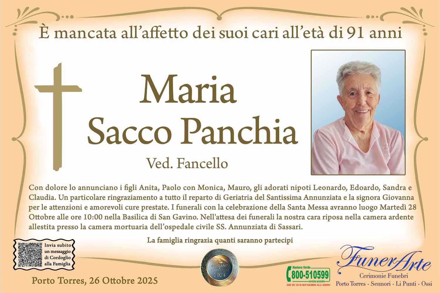 Con dolore lo annunciano i figli Anita, Paolo con Monica, Mauro, gli adorati nipoti Leonardo, Edoardo, Sandra e Claudia. Un particolare ringraziamento a tutto il reparto di Geriatria del Santissima Annunziata e la signora Giovanna per le attenzioni e amorevoli cure prestate. I funerali con la celebrazione della Santa Messa avranno luogo Martedì 28 Ottobre alle ore 10:00 nella Basilica di San Gavino. Nell'attesa dei funerali la nostra cara riposa nella camera ardente allestita presso la camera mortuaria dell’ospedale civile SS. Annunziata di Sassari.