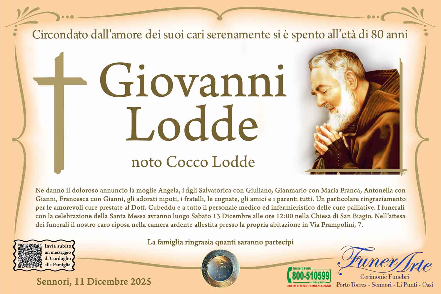 Ne danno il doloroso annuncio la moglie Angela, i figli Salvatorica con Giuliano, Gianmario con Maria Franca, Antonella con Gianni, Francesca con Gianni, gli adorati nipoti, i fratelli, le cognate, gli amici e i parenti tutti. Un particolare ringraziamento per le amorevoli cure prestate al Dott. Cubeddu e a tutto il personale medico ed infermieristico delle cure palliative. I funerali con la celebrazione della Santa Messa avranno luogo Sabato 13 Dicembre alle ore 12:00 nella Chiesa di San Biagio. Nell’attesa dei funerali il nostro caro riposa nella camera ardente allestita presso la propria abitazione in Via Prampolini, 7.