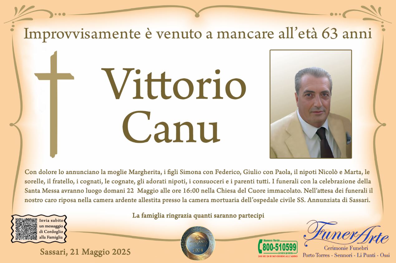 Con dolore lo annunciano la moglie Margherita, i figli Simona con Federico, Giulio con Paola, il nipoti Nicolò e Marta, le sorelle, il fratello, i cognati, le cognate, gli adorati nipoti, i consuoceri e i parenti tutti. I funerali con la celebrazione della Santa Messa avranno luogo domani 22 Maggio alle ore 16:00 nella Chiesa del Cuore immacolato. Nell'attesa dei funerali il nostro caro riposa nella camera ardente allestita presso la camera mortuaria dell’ospedale civile SS. Annunziata di Sassari.