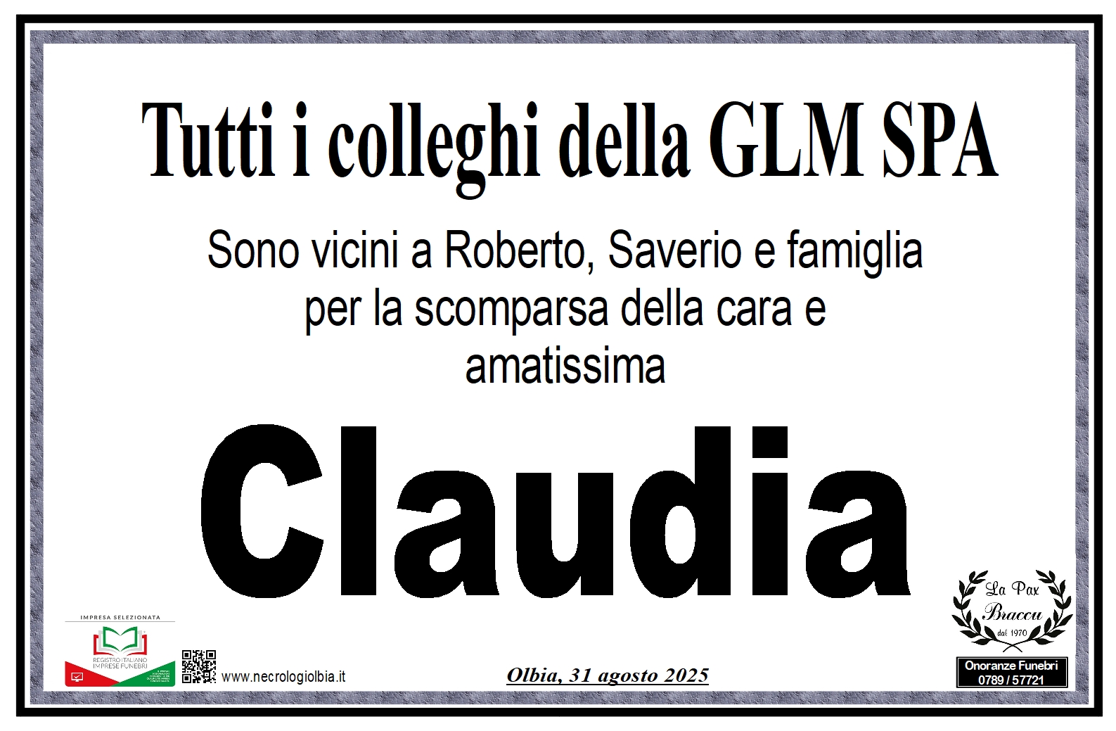 I funerali avranno luogo lunedì 1° settembre alle ore 11,00 presso la Sala del Regno dei Testimoni di Geova, partendo dalla Casa Funeraria La Pax Braccu Via Bazzoni Sircana, 13D.