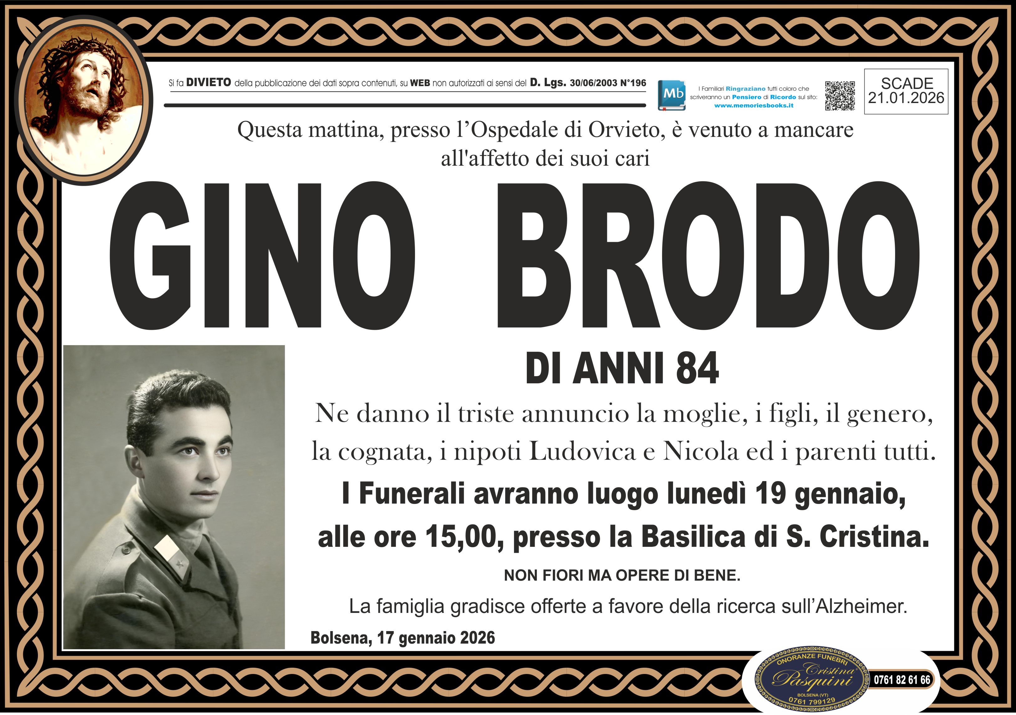 I Funerali avranno luogo lunedì 19 gennaio,