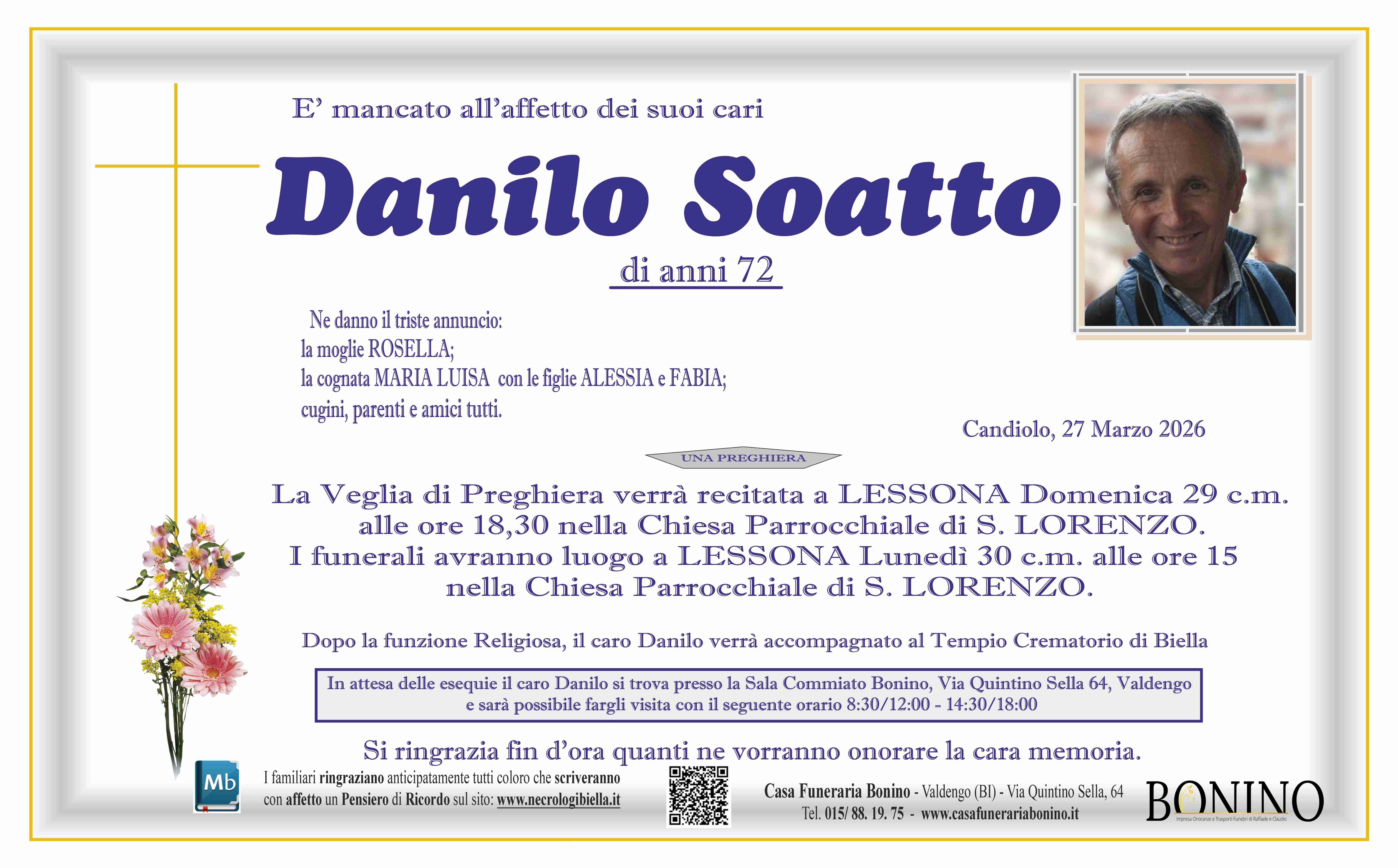 Cara Rosella Ho appena letto il necrologio per Danilo e desidero mandarti un abbraccio da parte mia e di Valter. Non potremo partecipare perché ci siamo appena trasferiti ma con una preghiera ci faremo presenti