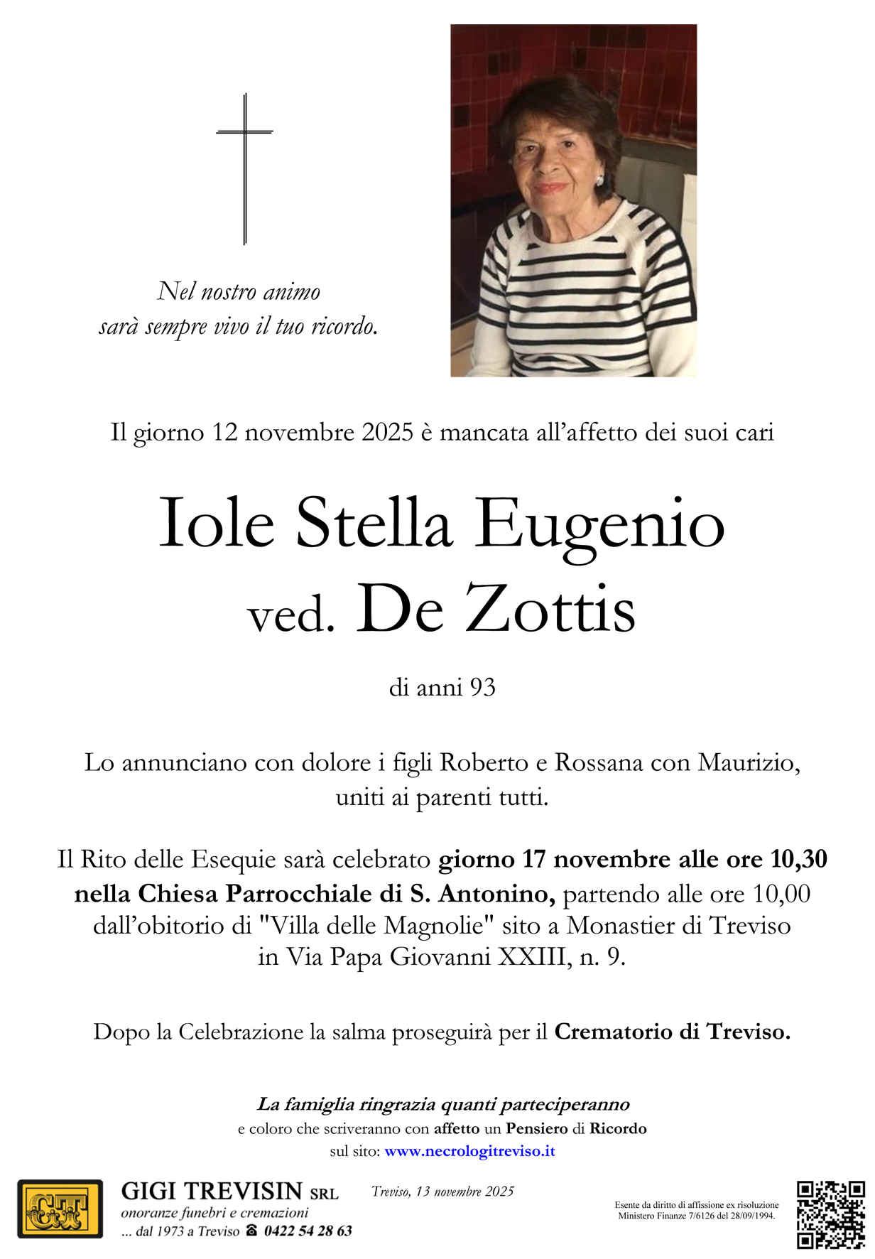 A Rossana, Roberto e Maurizio porgiamo le nostre più sentite condoglianze per la perdita della Sig.ra Iole Stella, che ricordiamo sempre gentile, cordiale e raffinata. Comprendiamo il vuoto che lascia una persona cara: è incolmabile. Vi siamo vicini in questo triste momento. Valentina e Eddie