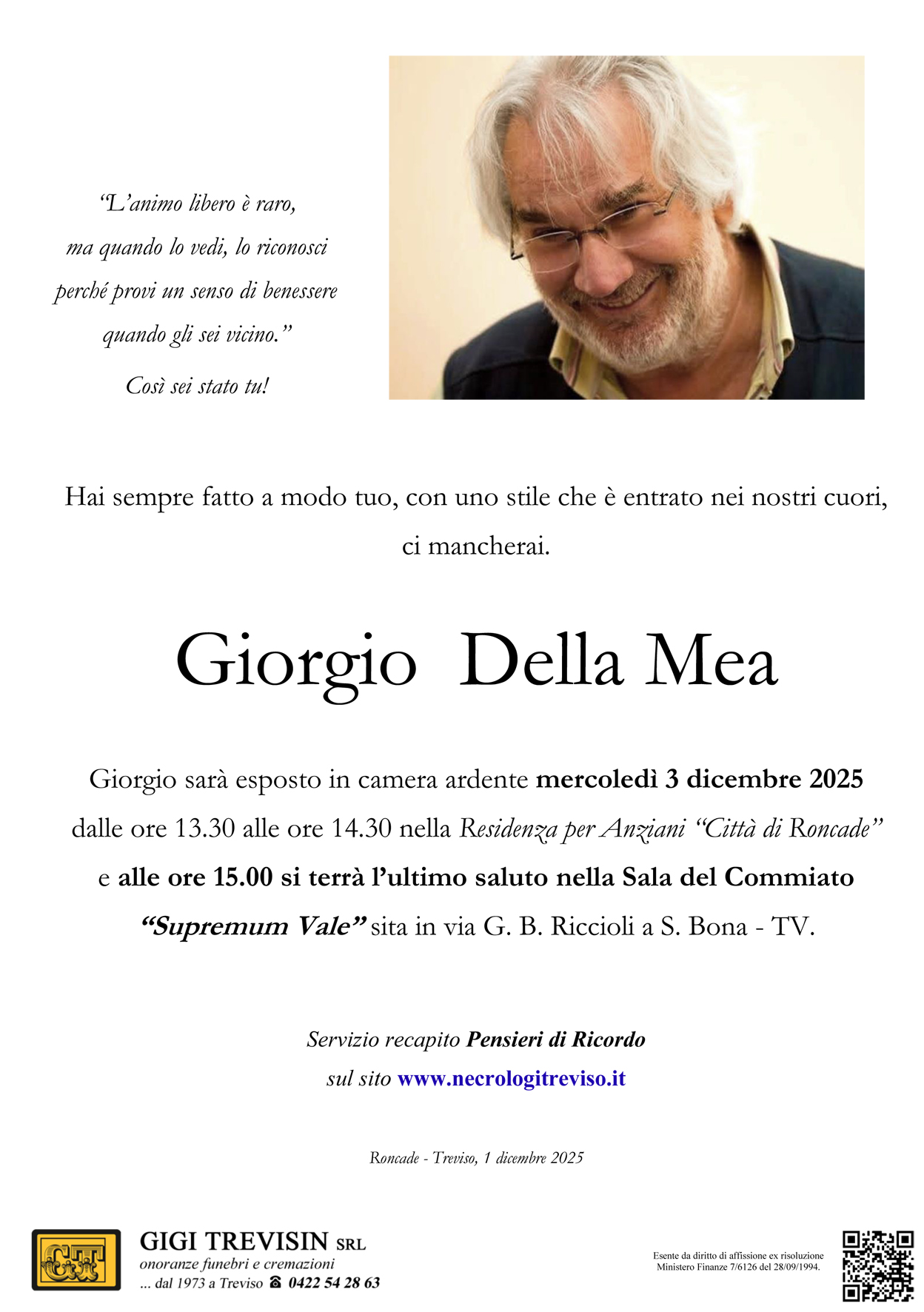 PER GIORGIO DELLA MEA UN NON – NECROLOGIO 1 dicembre 2025 Ciao. Questo non è un necrologio, perché l’amico e compagno Giorgio che, per il mondo mercificato e burocratizzato, basato sul feticcio del denaro, sarebbe scomparso tre giorni fa, a fine novembre, per noi : Angelo, Federico, Daniela, Emanuela, me stesso (Mario) e pochi altri costituenti un piccolo gruppo trevigiano appartenente al Movimento nel 1980-81, è sempre vivo e vitale, allegro nella sua malinconia sottotraccia, pronto a difendere gli ultimi, molto critico verso la società dello spettacolo, secondo la visione di Guy Debord e verso i simulacri lavoristi, secondo il filosofo Jean Baudrillard, che citava di frequente. Giorgio era il nostro punto di riferimento quotidiano, e lo è tutt’ora : il tempo non esiste, per la fisica quantistica attraversata dallo sguardo del fisico veronese settantasettino di Radio Alice di Bologna, marzo ’77, amico dell’ editore ribelle Giorgio Bertani, Carlo Rovelli. Incontravamo sempre Giorgio per i bar e osterie di Treviso, si discuteva delle nostre attività nel Movimento, opponendoci animatamente ai teoremi repressivi del Caso 7 aprile che stavano stroncando con anni di carcerazione preventiva gran parte della sinistra antagonista, ma prendendo le distanze anche da posizioni veterocomuniste rigide e autoritarie che allora imperversavano. Erano anni difficili, ma il caro amico e compagno Giorgio era capace, col suo sguardo sornione da autentico bambino libero, di sottrarsi alle angherie e alle molteplici situazioni dolorose del periodo con la sua visione disincantata e poetica al contempo, elaborando strategie difensive di portata universale. Diceva infatti che si doveva uscire dalla forma-lavoro, dalla forma-merce, attraverso attività non monetizzabili, non legate alla forma-denaro, attività controproduttive basate sul principio di reciprocità, non dipendenti dalla produzione capitalistica e dal consumismo. Giorgio era, anzi, è molto generoso e aiutava sempre amici e compagni in difficoltà. Sempre elegante e gentile, considerava il suo lavoro (settore discografico) come un’ attività giocosa, per certi versi divertente. Era sempre di buon umore e considerava la sua vita ben riuscita, quasi felice, anche perché la sua lotta contro la società lavorista si era conclusa, secondo lui, a suo netto favore. Politicamente, aveva legato con i Gruppi Anarchici, con Potere Operaio e con l’Autonomia, con Lotta Continua. Era comunque dell’idea che la militanza non doveva essere concepita come una forma autosacrificale. Il nostro affezionatissimo amico padroneggiava anche la lingua spagnola, tanto che, non di rado, la sua inflessione si avvicinava a quella del parlato sudamericano : aveva infatti trascorso un lungo periodo della sua infanzia, come altri amici e compagni (Gianni), nell’America del Sud. Giorgio era, è noto anche come appassionato giocatore di bridge. Giorgio amava, ama riferirsi al Marx dei Grundrisse, al Marx non lavorista del futuro, ma citava, cita spesso anche il pensiero ossessivo, una forma di coazione a ripetere, di Proust : “La vita dura lo spazio di un mattino” ma, se l’ attimo è un eterno ( Nietzsche, Zenone di Elea) e il tempo non è progressivo-lineare ma circolare (v. i cicli cosmici in Anassimandro, Eraclito, Empedocle, Platone, ecc.), allora vi è la possibilità del ritorno, la scomparsa è solo temporanea rispetto allo sguardo (Emanuele Severino), in attesa di incontrare nuovamente per i bar e le osterie di Treviso il nostro immenso e simpatico amico che adorava i gatti, Giorgio Della Mea. Intanto, però, il suo posto vuoto suscita in noi forte sgomento e profonda tristezza. E il senso di solitudine aumenta. Mario C.