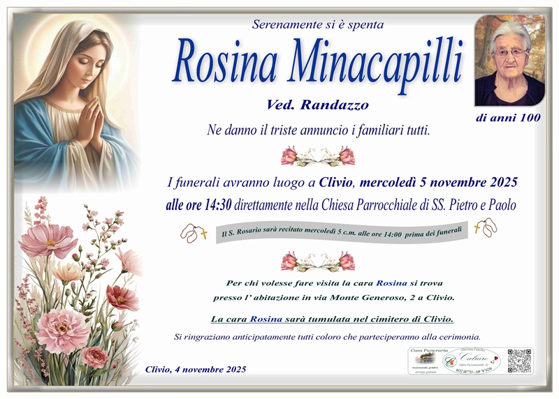 Il S. Rosario sarà recitato mercoledì 5 novembre alle ore 14:00 prima dei funerali.
