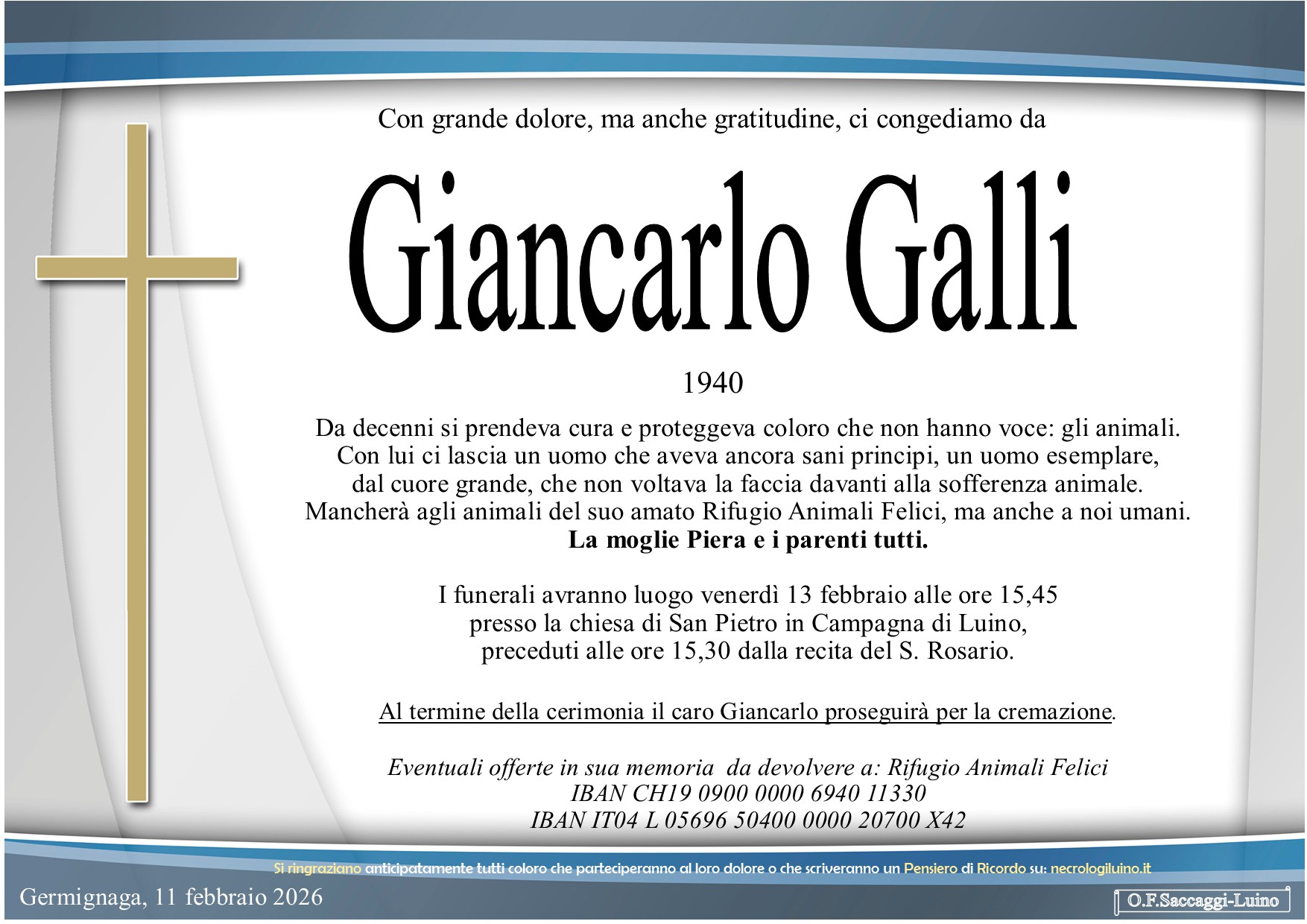 I familiari ringraziano anticipatamente tutti coloro che parteciperanno alla cerimonia funebre