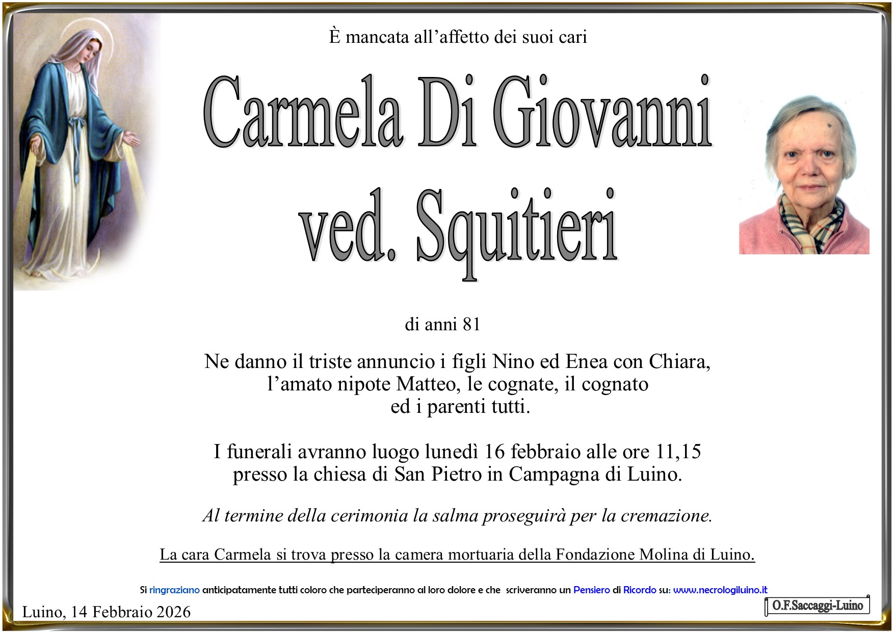 I familiari ringraziano anticipatamente tutti coloro che parteciperanno alla cerimonia funebre