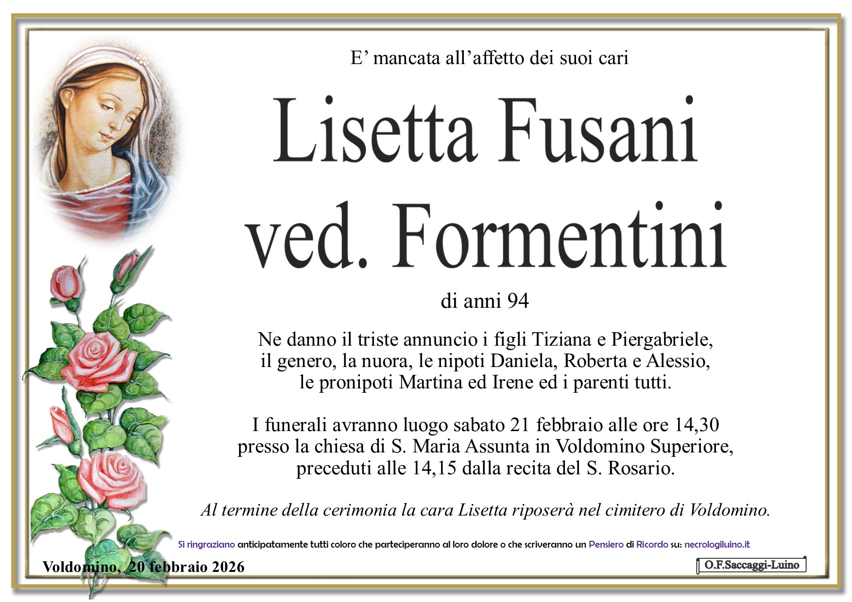 I familiari ringraziano anticipatamente tutti coloro che parteciperanno alla cerimonia funebre