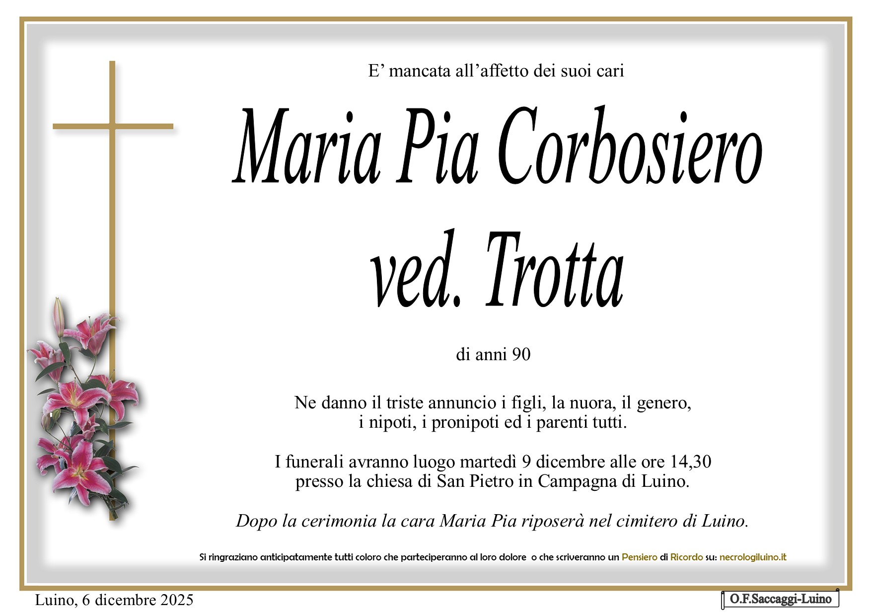 I familiari ringraziano anticipatamente tutti coloro che parteciperanno alla cerimonia funebre
