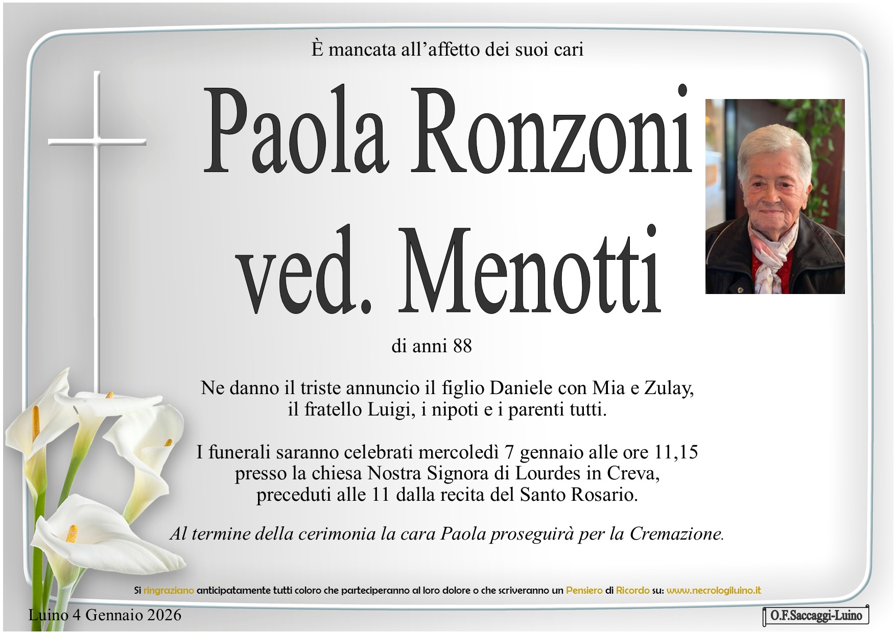 I familiari ringraziano anticipatamente tutti coloro che parteciperanno alla cerimonia funebre