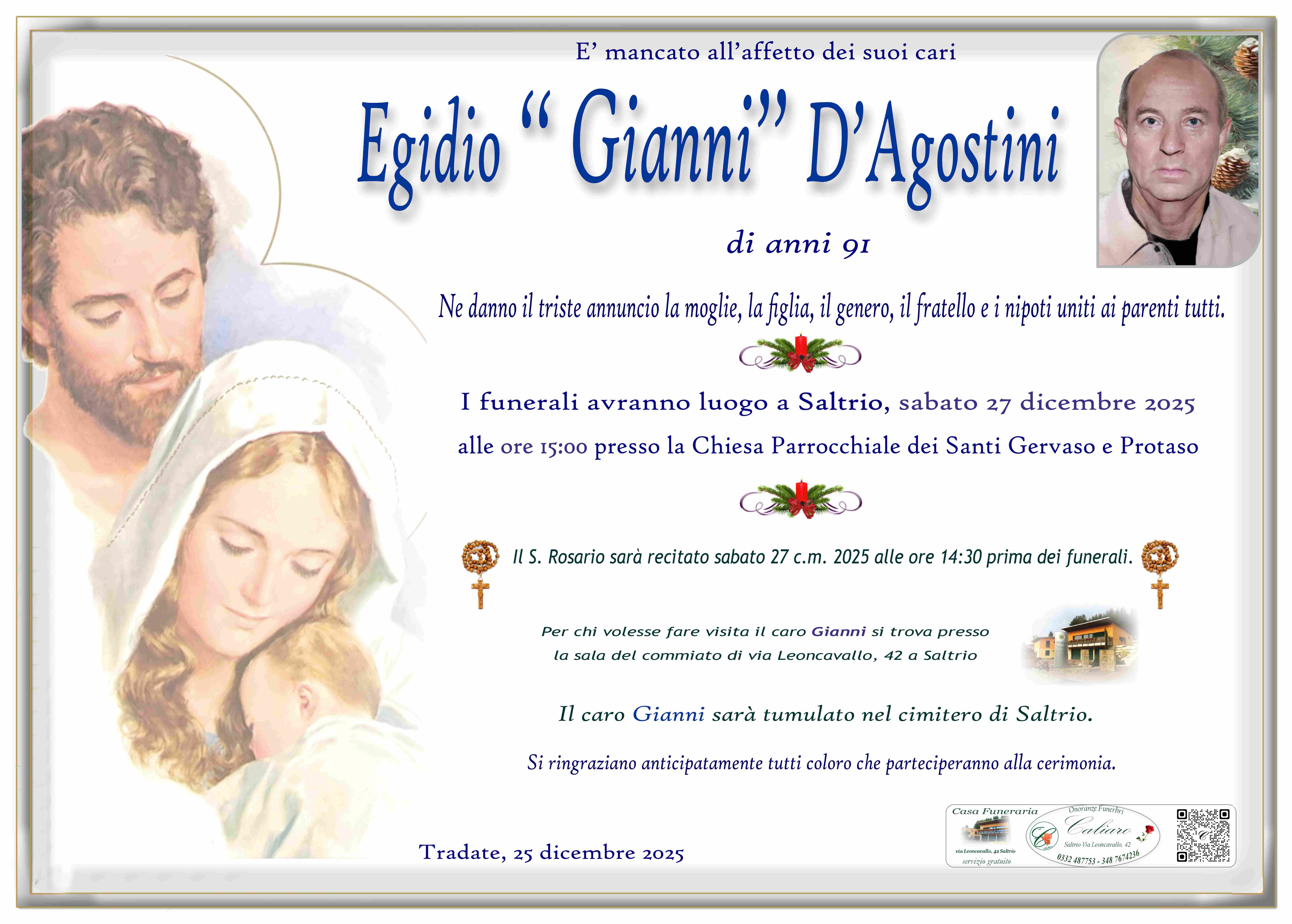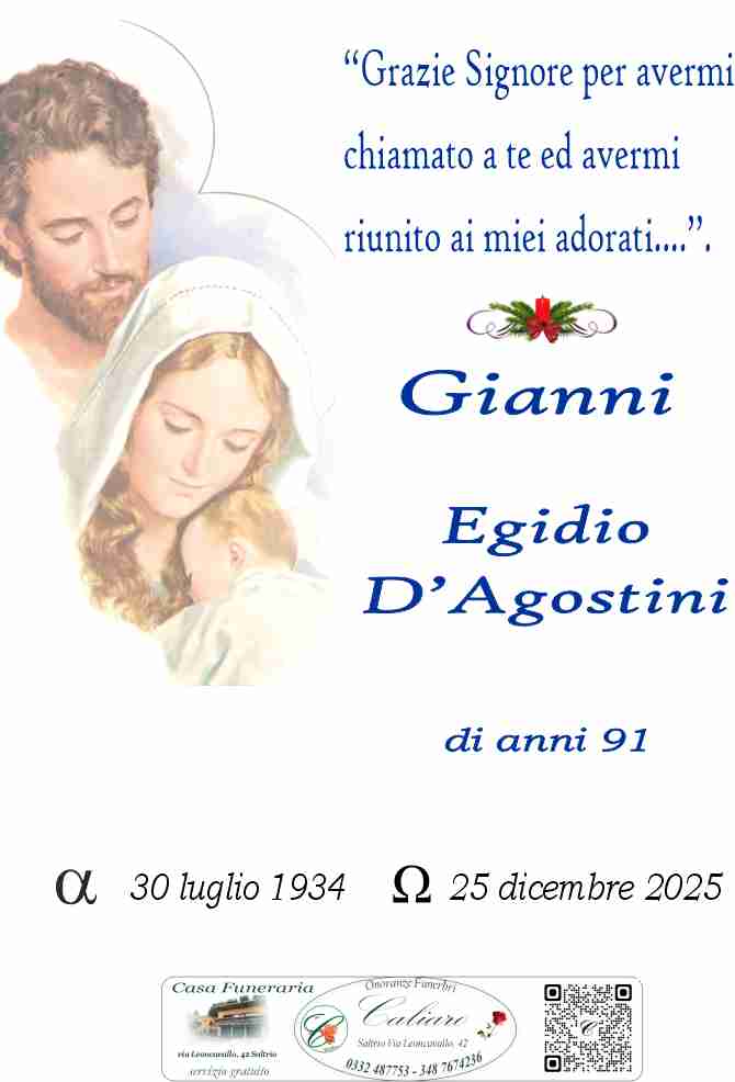 I funerali avranno luogo a Saltrio, sabato 27 dicembre 2025