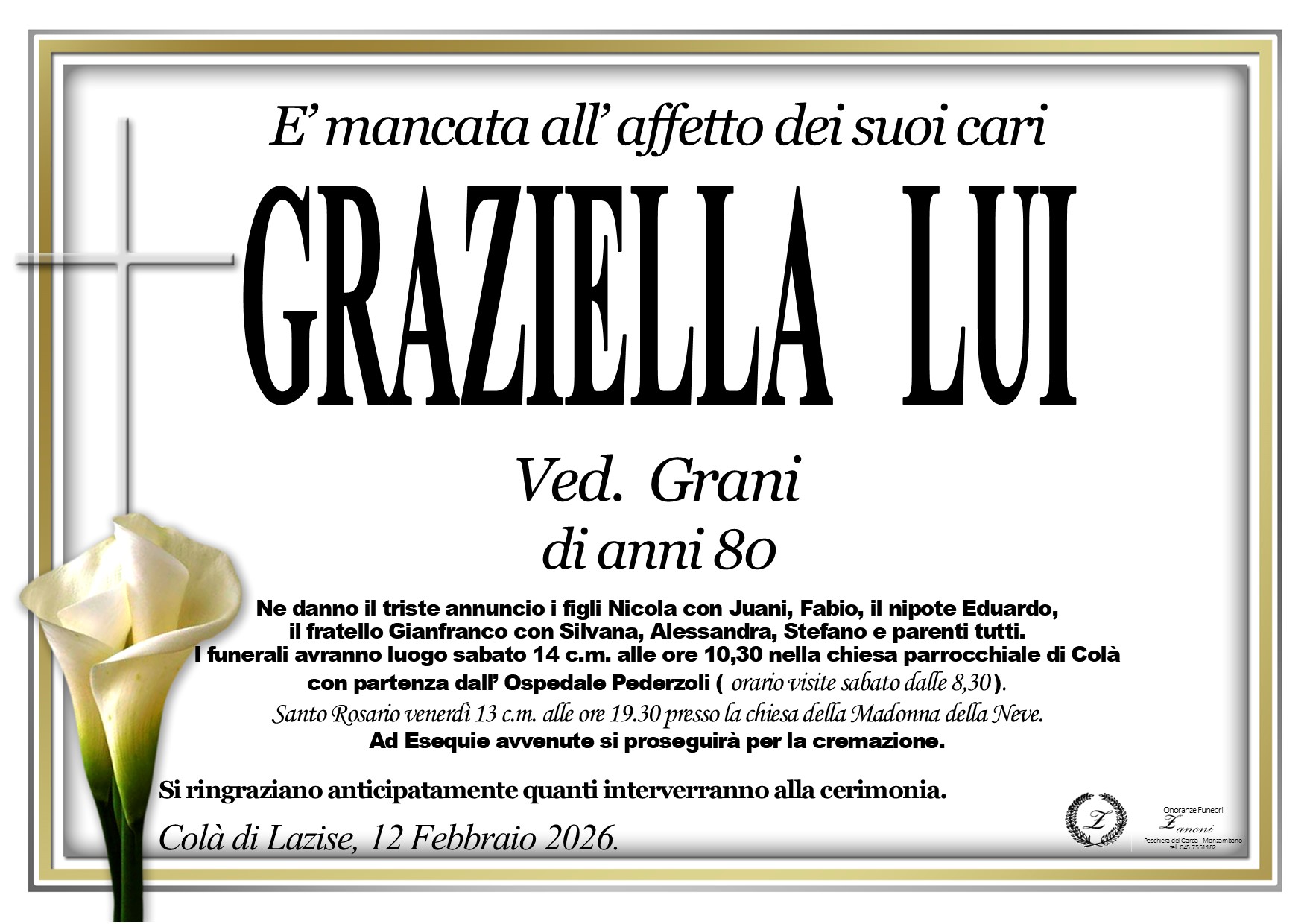 I familiari ringraziano anticipatamente tutti coloro che parteciperanno alla cerimonia funebre