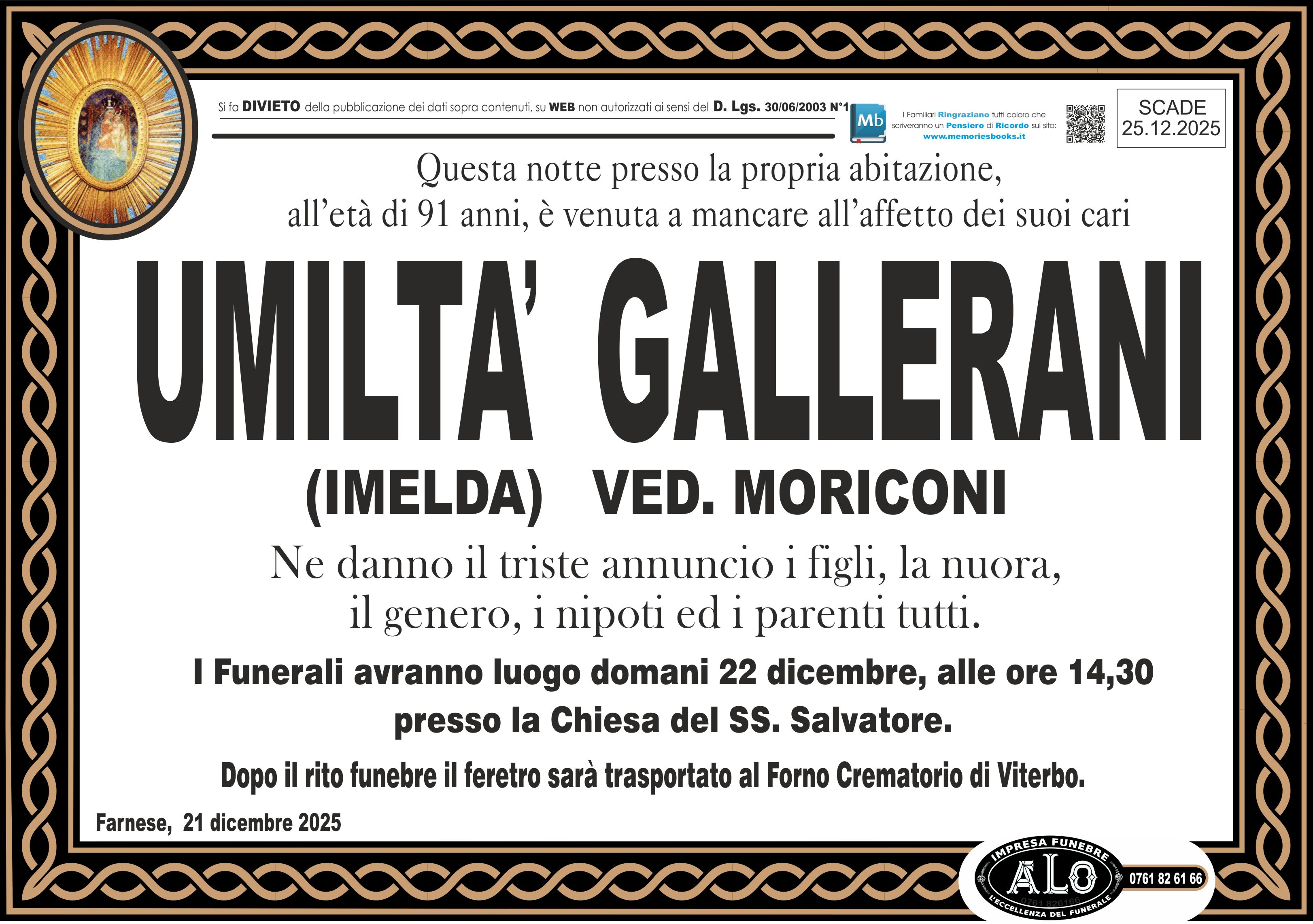 I Funerali avranno luogo domani 22 dicembre, alle ore 14,30