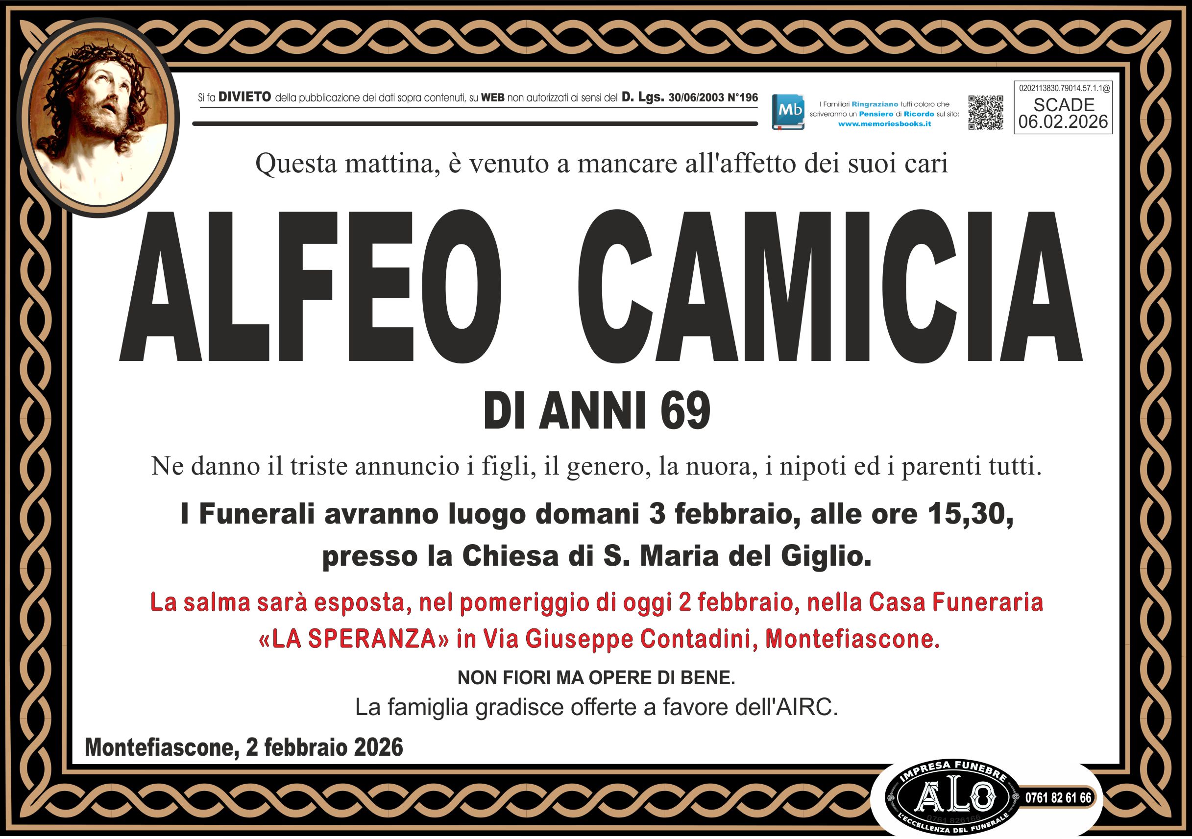 I Funerali avranno luogo domani 3 febbraio, alle ore 15,30,