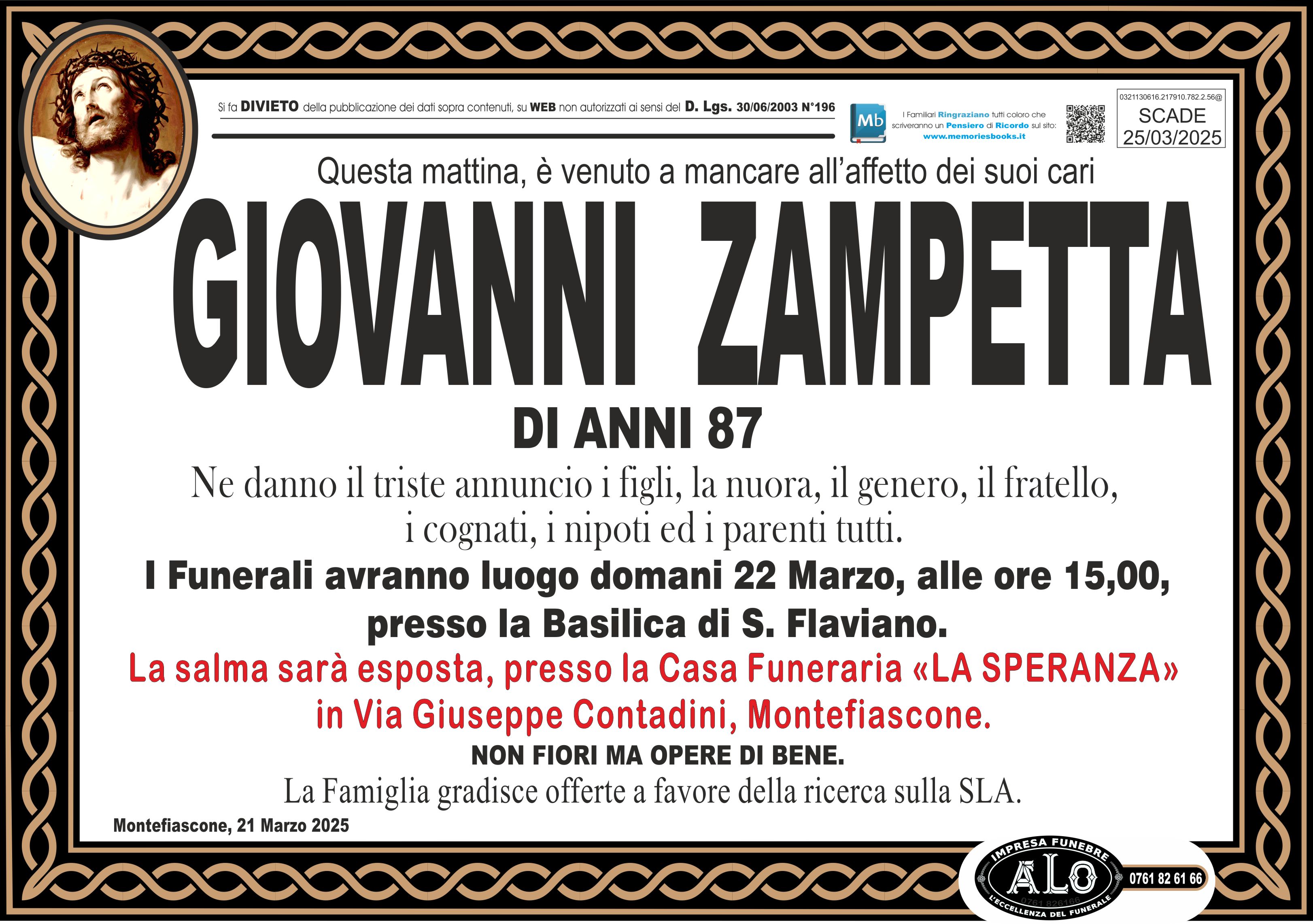 I Funerali avranno luogo domani 22 Marzo, alle ore 15,00,