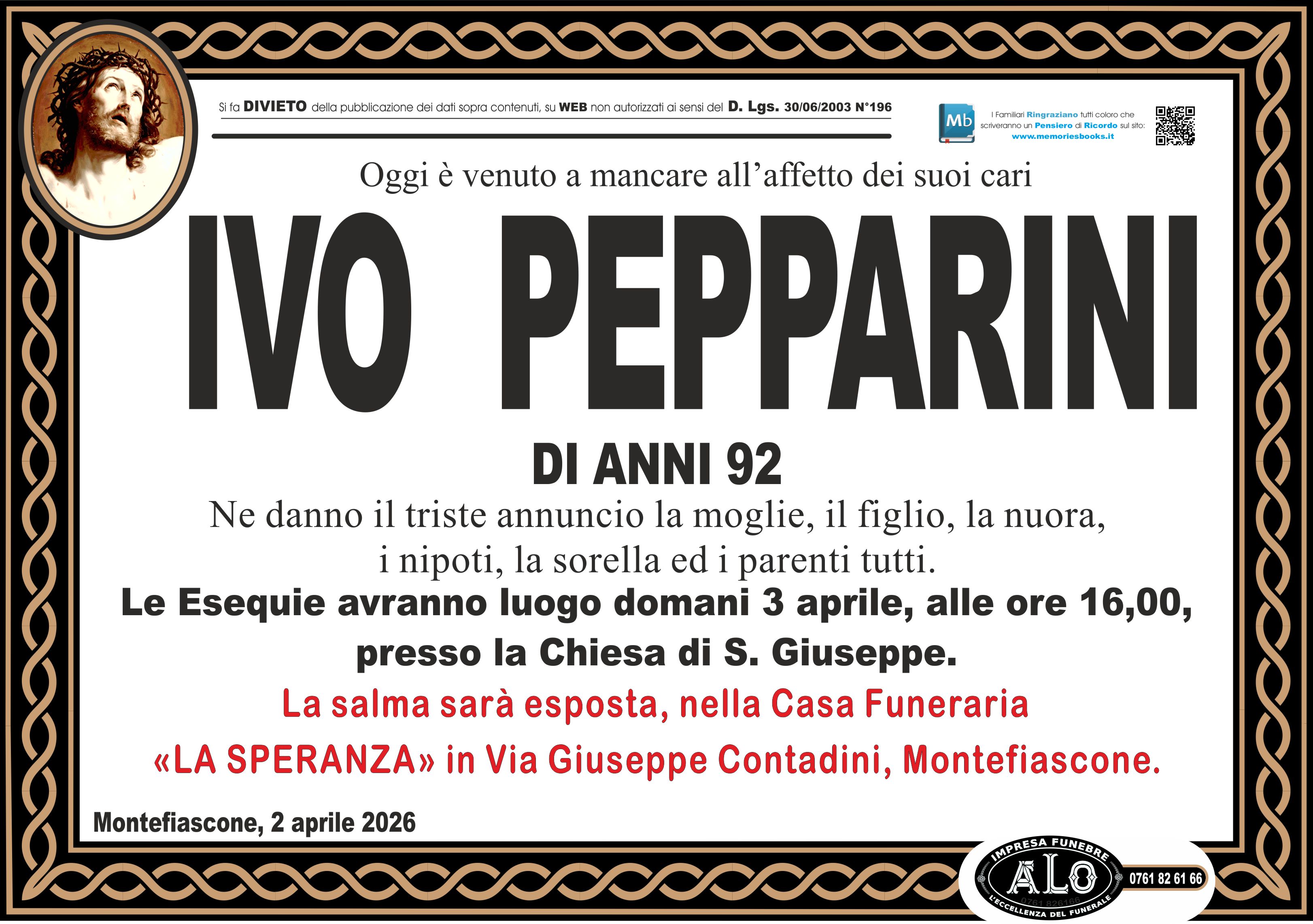 Le Esequie avranno luogo domani 3 aprile, alle ore 16,00,
