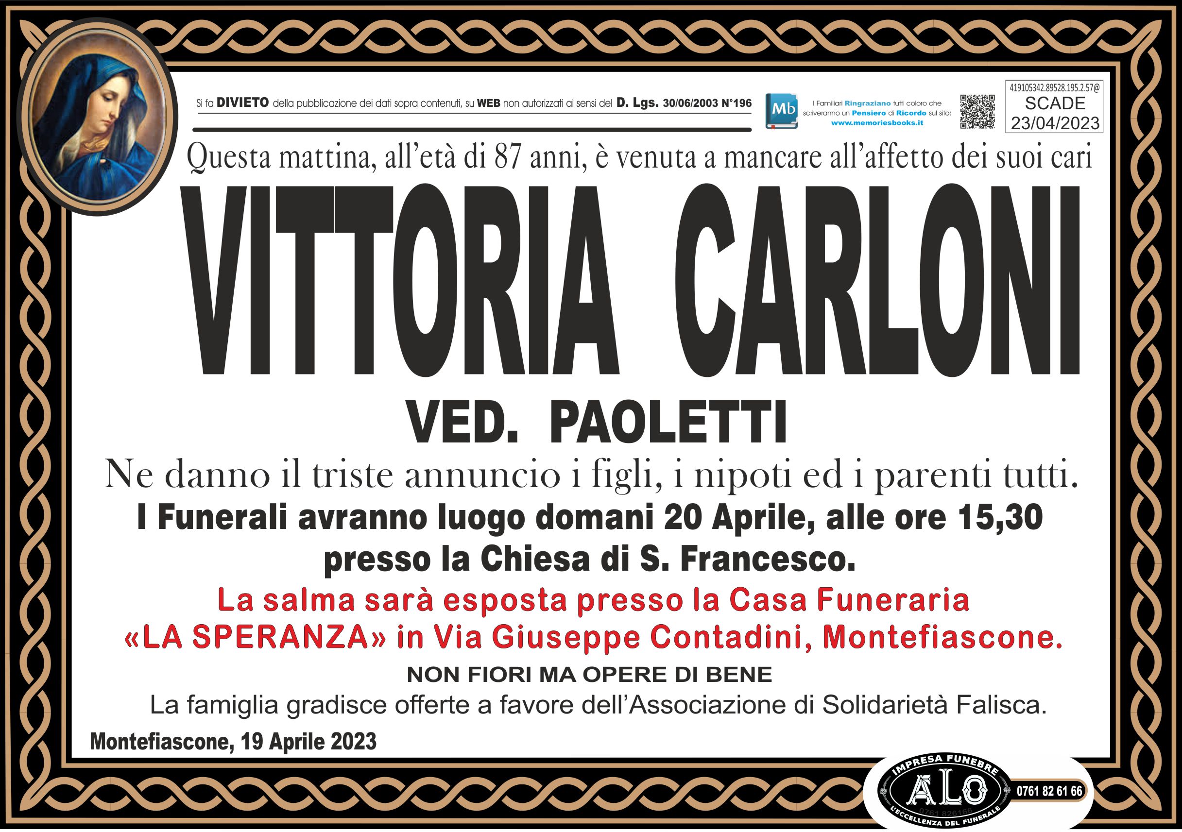 I Funerali avranno luogo domani 20 Aprile, alle ore 15,30