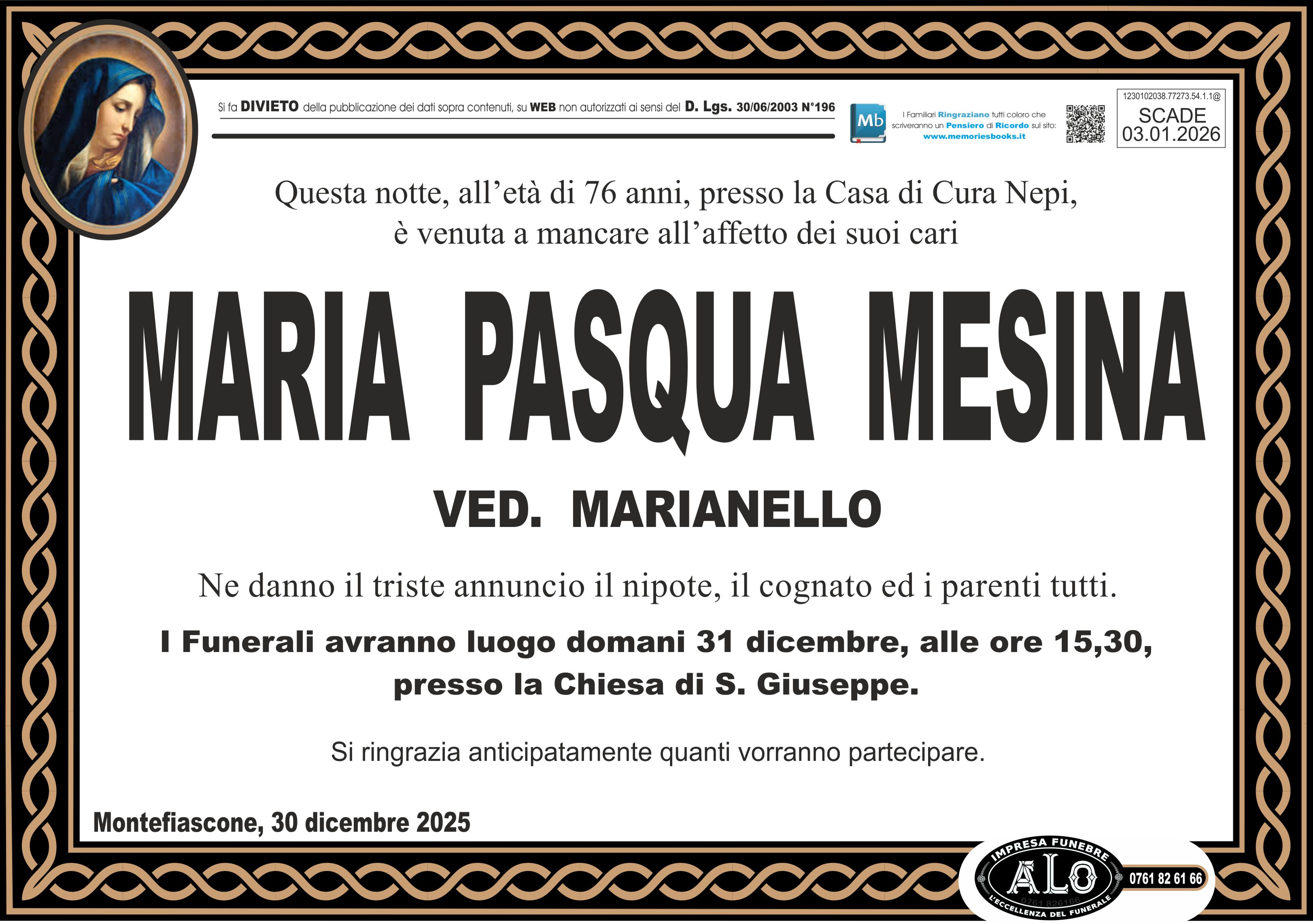 I Funerali avranno luogo domani 31 dicembre, alle ore 15,30,