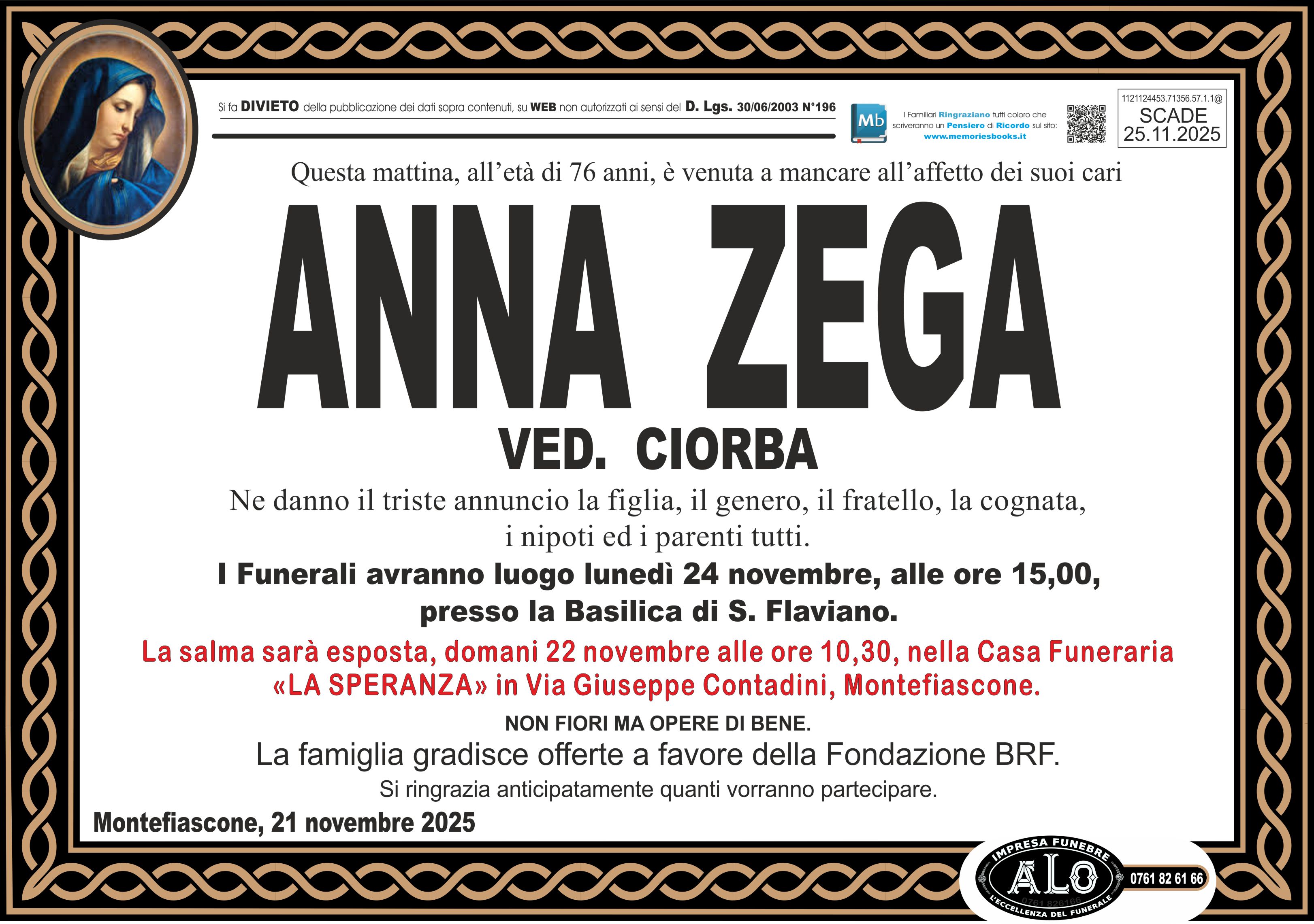 La salma sarà esposta, domani 22 novembre alle ore 10,30, nella Casa Funeraria